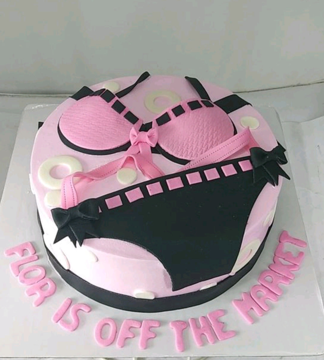 Pink and black lingerie themed cake with fondant bra and panty decorations and a message on the board.