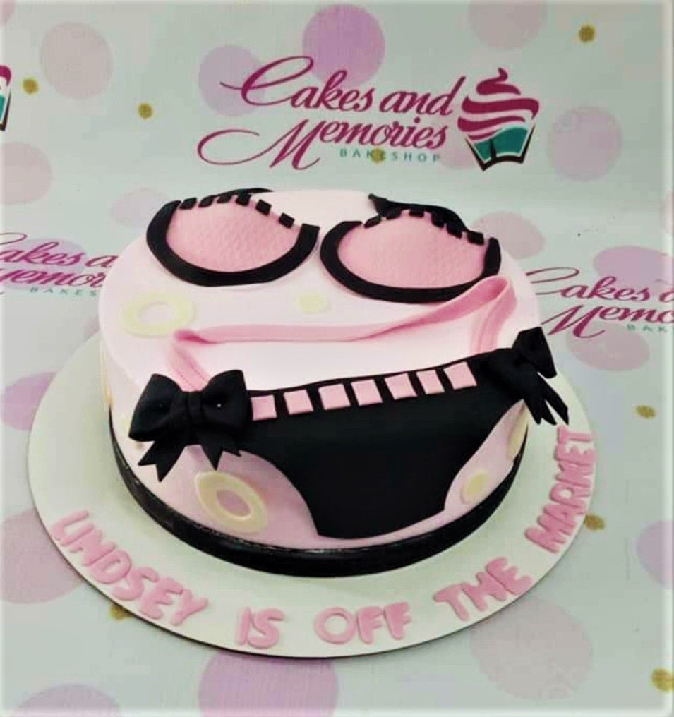 Pink bachelorette cake featuring a black and pink fondant lingerie design with bows and a message on the base board.