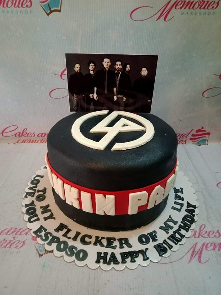 Black Linkin Park themed birthday cake with white logo on top and band photo printout topper.
