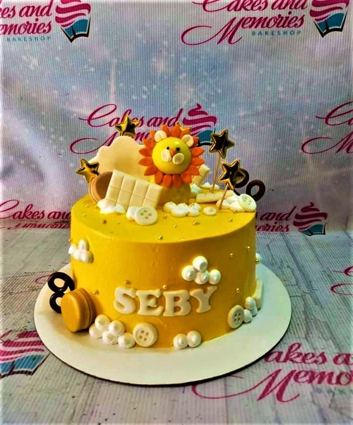 Yellow lion themed birthday cake with white clouds, chocolate bars, and gold stars for Seby.
