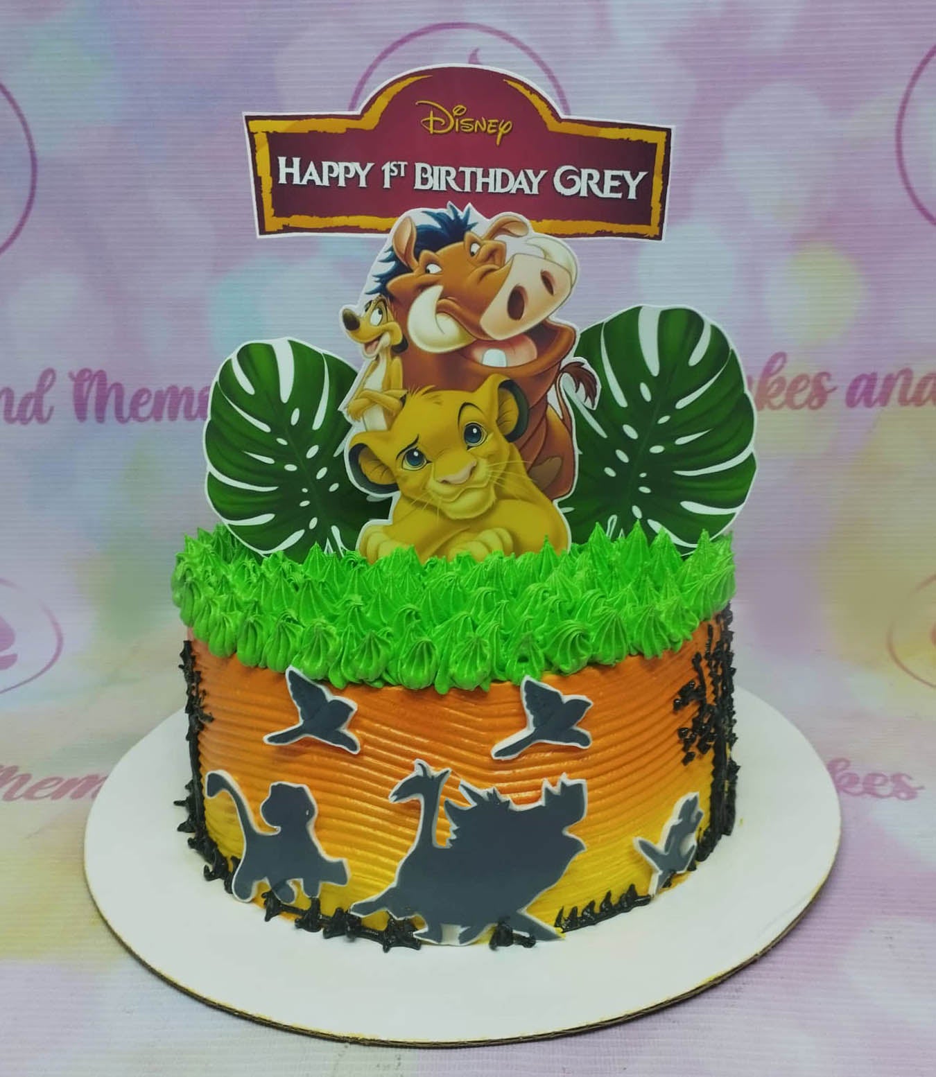 Lion King themed birthday cake with Simba, Pumbaa, and Timon toppers on orange and yellow gradient icing with green grass piping.