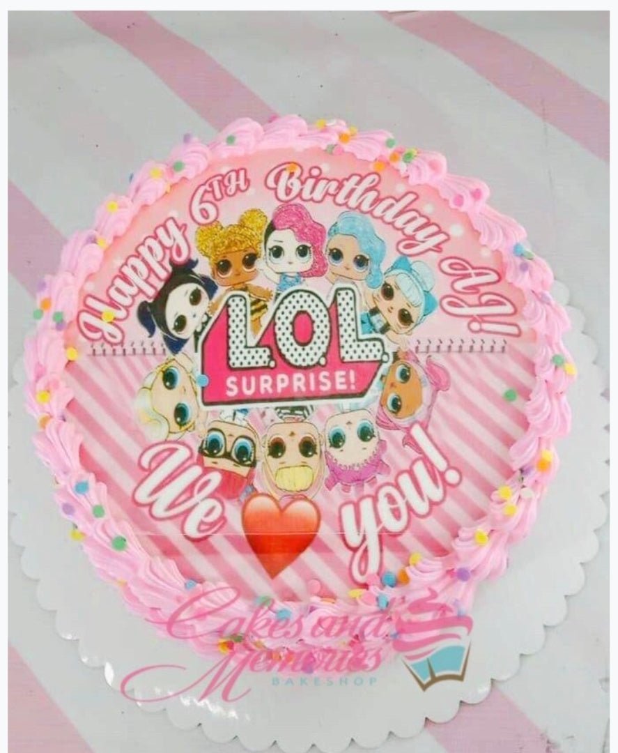 Pink LOL Surprise themed birthday cake with character printouts, pink icing rosettes, and colorful sprinkles.