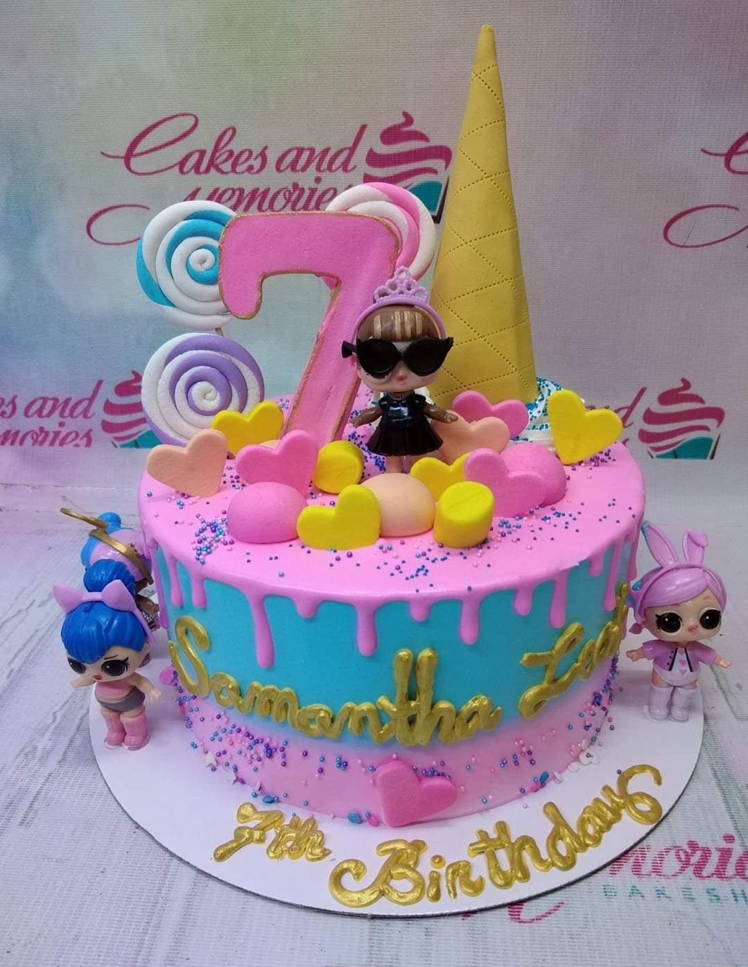Pink and blue LOL Surprise themed birthday cake with a large number 7, lollipops, and character figurines.