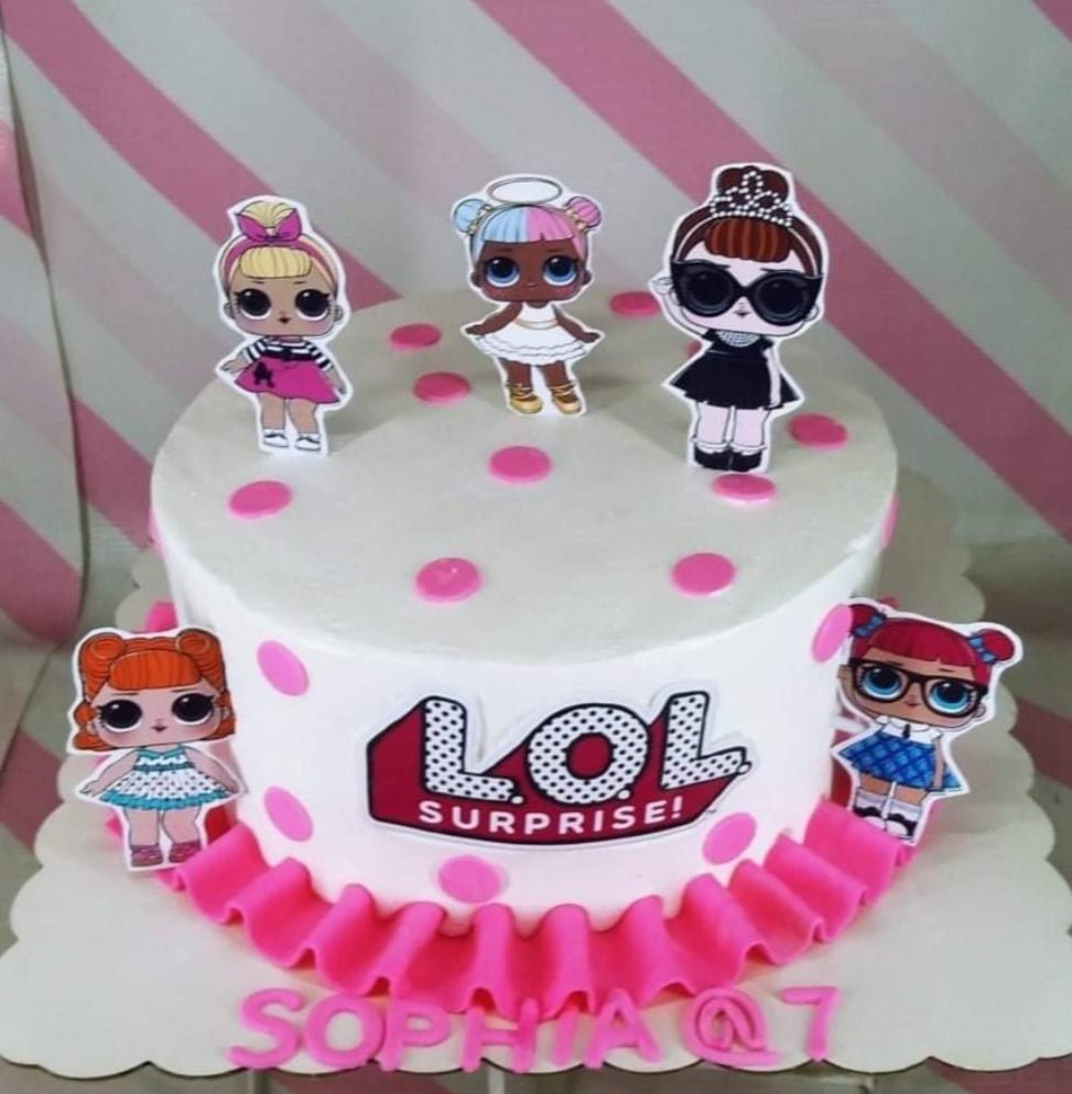 White 1-tier LOL Surprise themed cake with pink polka dots, pink ruffles, and character printouts.