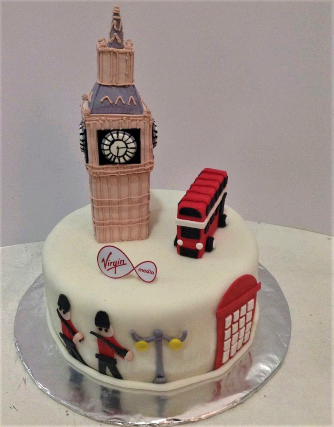 London themed white fondant cake featuring Big Ben, a red double-decker bus, and Royal Guards with a Virgin Media logo.