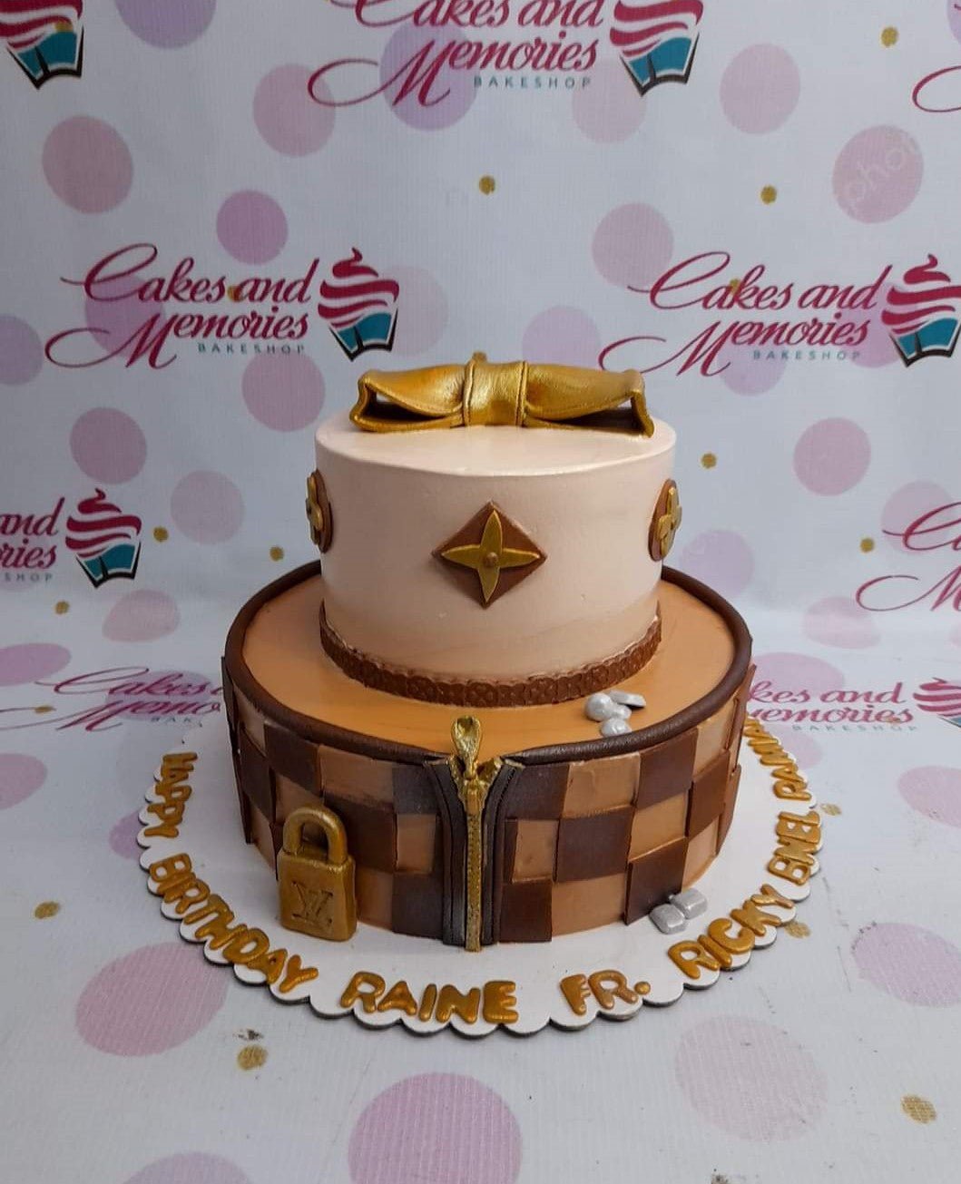 Two-tier Louis Vuitton themed cake with brown checkerboard pattern, gold bow, and edible lock and zipper details.