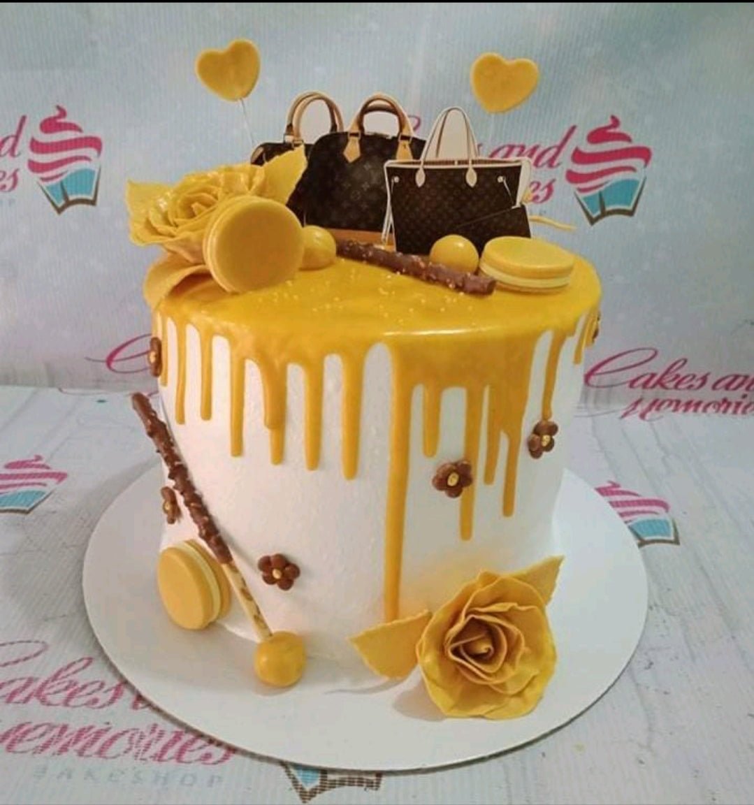 White 1-tier cake with yellow drip, Louis Vuitton bag printouts, yellow macarons, and yellow roses.