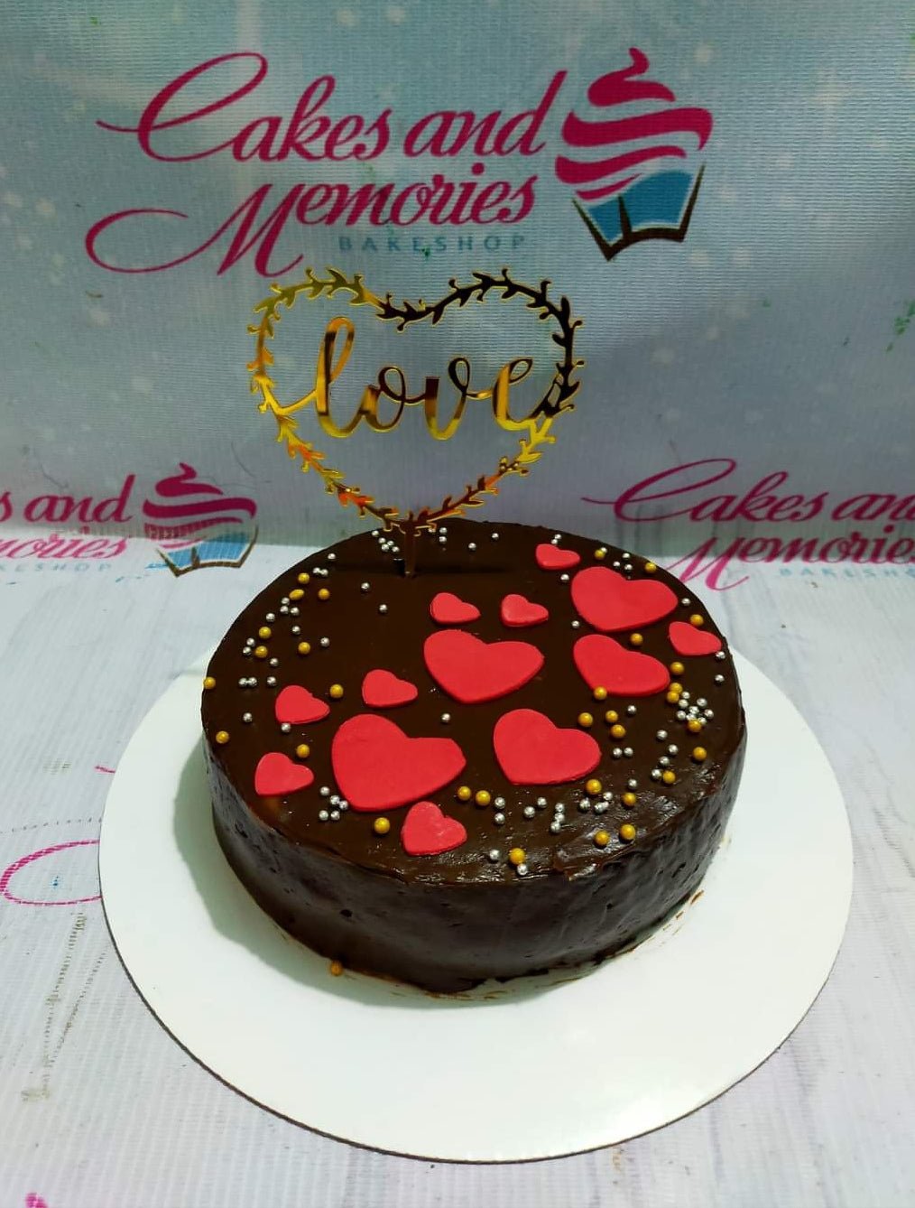 Chocolate cake with red fondant hearts and gold and silver sprinkles, topped with a gold Love heart topper.