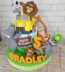 Madagascar 1 Tier Fondant - yellow, orange, green theme with Yellow safari truck and Mort the lemur