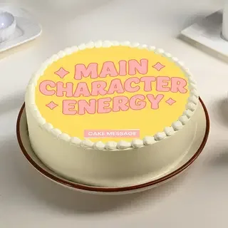 Minimalist yellow and white round cake with pink 'Main Character Energy' text and star accents.