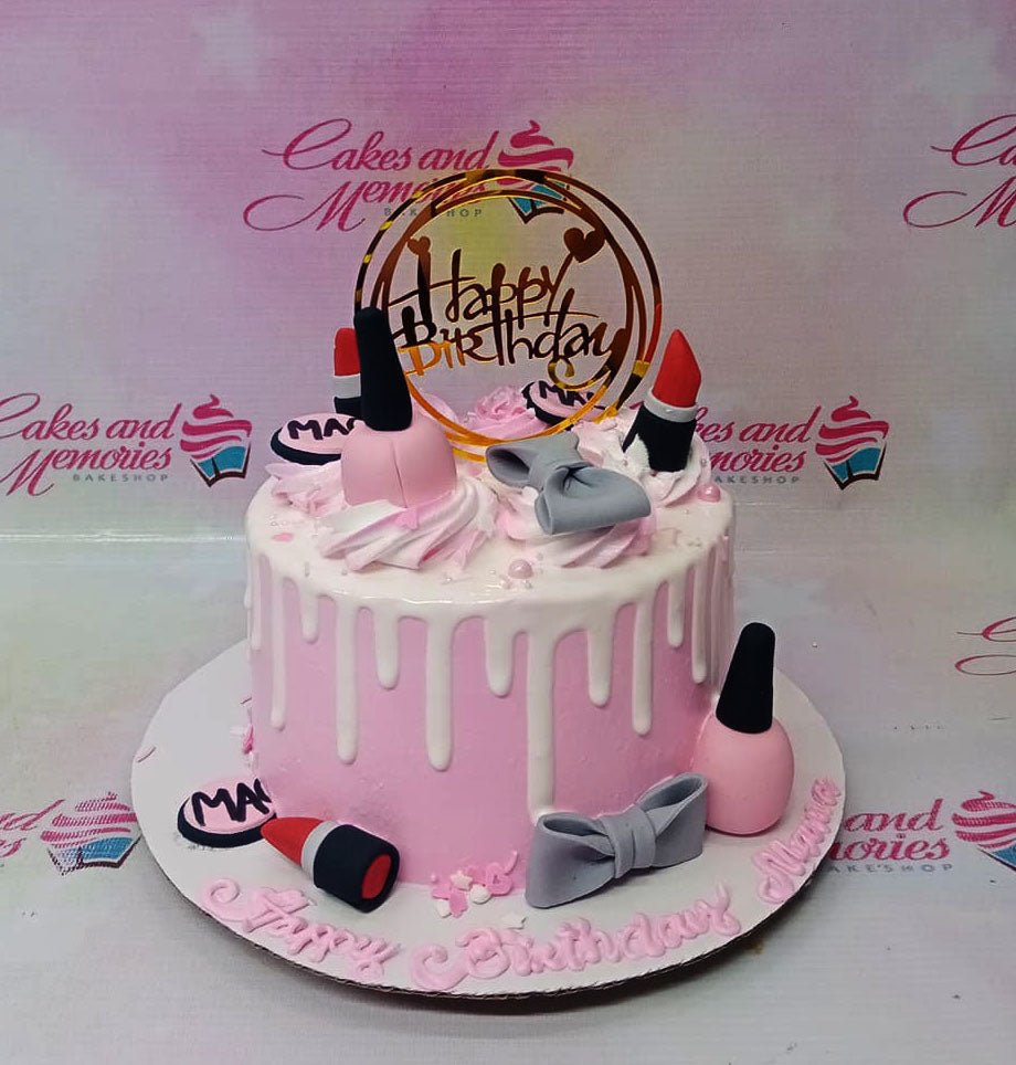 Pink makeup themed birthday cake with white icing drip, fondant lipstick, nail polish, and a gold Happy Birthday topper.