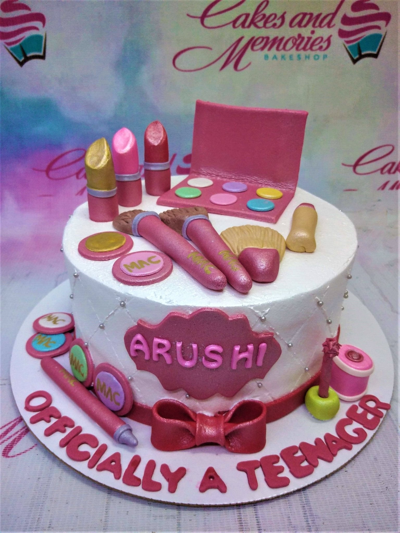 White fondant makeup themed cake with edible 3d lipstick, eyeshadow palette, and brushes for a 13th birthday celebration.