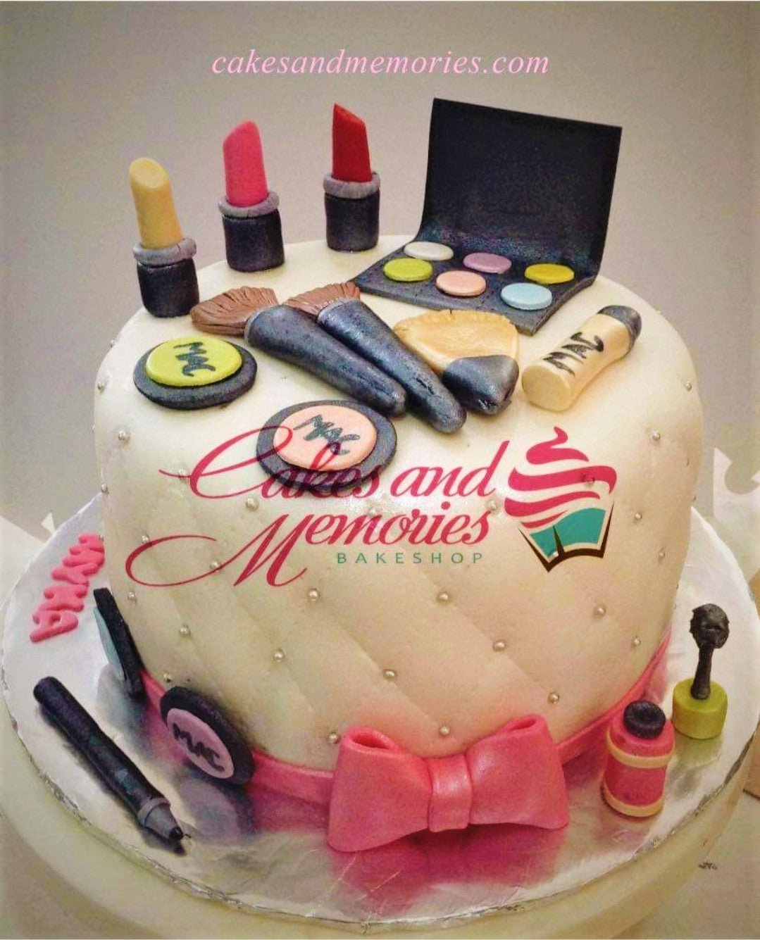 White fondant cake with quilted pattern and silver pearls, decorated with edible makeup toppers like lipstick, brushes, and eyeshadow palette.