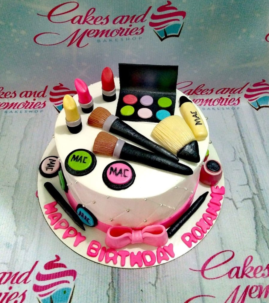White round cake decorated with edible fondant makeup items including lipsticks, brushes, and an eyeshadow palette with pink accents.
