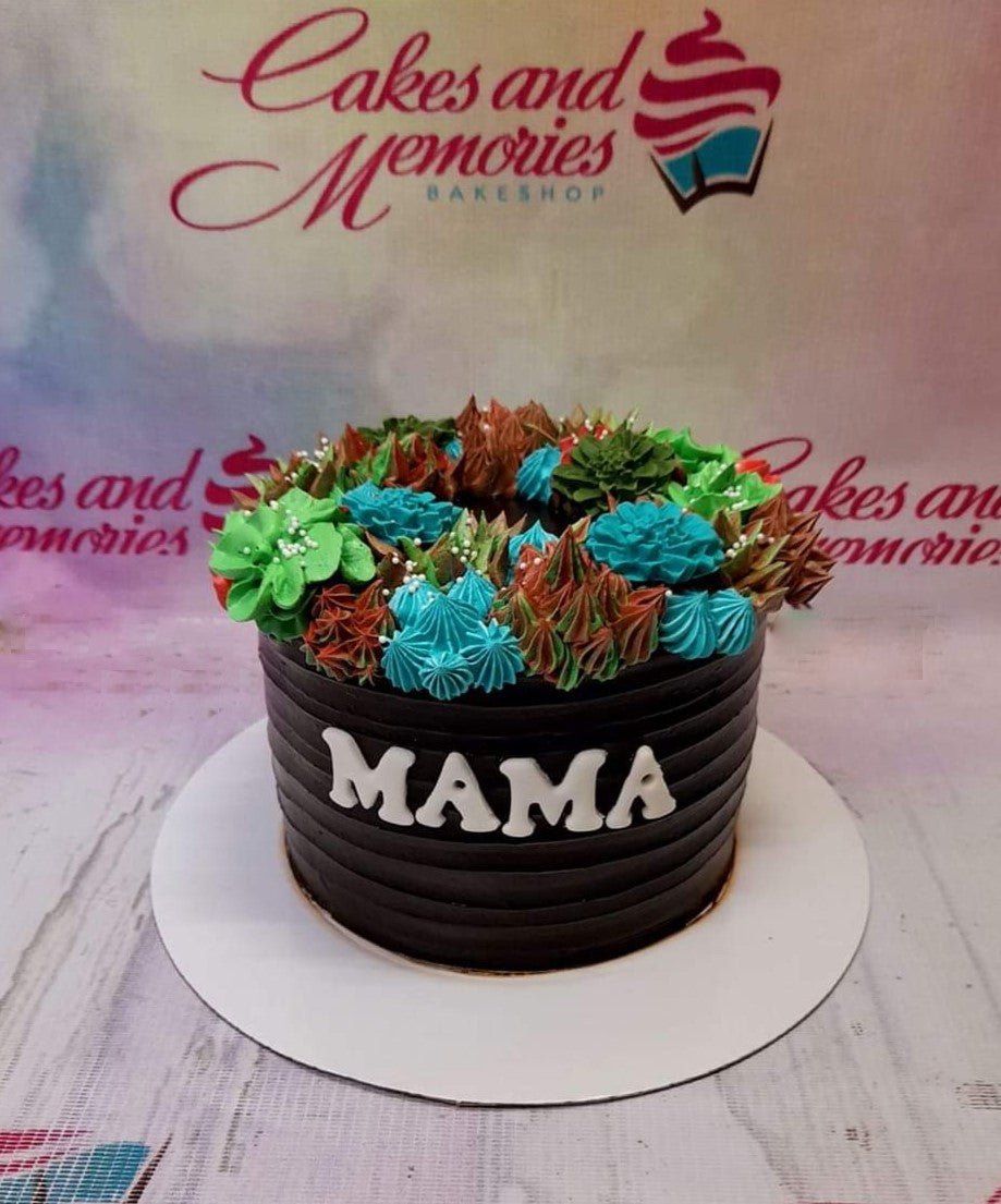 Chocolate cake with dark brown horizontal icing ridges and a colorful crown of teal, green, and brown icing rosettes and white pearls.