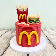 Red McDonald's themed birthday cake with fondant burger and fries toppers and the golden arches logo on the side.