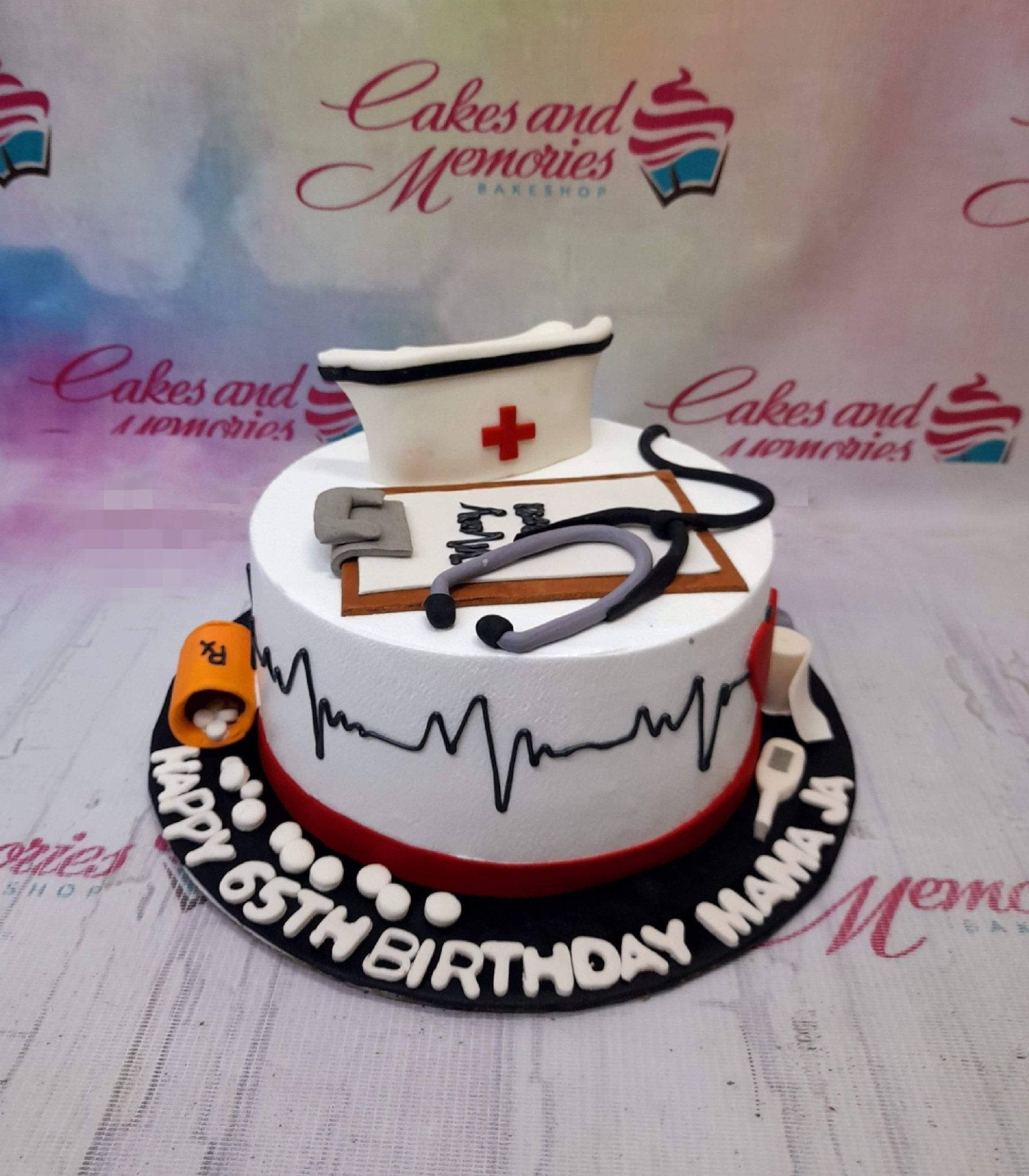 White medical themed cake with a nurse hat, stethoscope, clipboard, and EKG line for a 65th birthday.