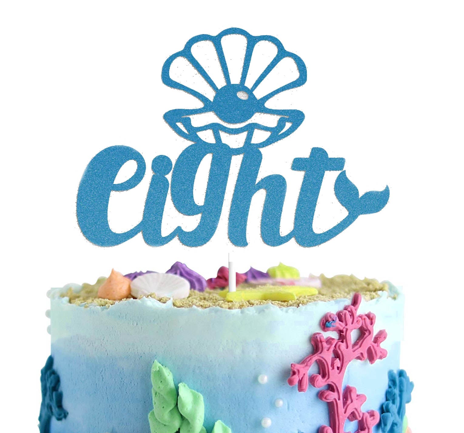 This blue ombre mermaid birthday cake is perfect for celebrating an eighth birthday. The design features a single tier with a beautiful gradient from light to deep blue icing. It is decorated with pink gumpaste coral, green seaweed, and white pearls to create an underwater scene. A large glittery blue shell topper with the word 'eight' sits prominently on top of a sandy biscuit base. This cake is ideal for any young girl who loves the ocean and mermaids. Order your custom celebration cake today through Genie.ph for delivery in Cebu City, Mandaue, or Lapu-lapu City.