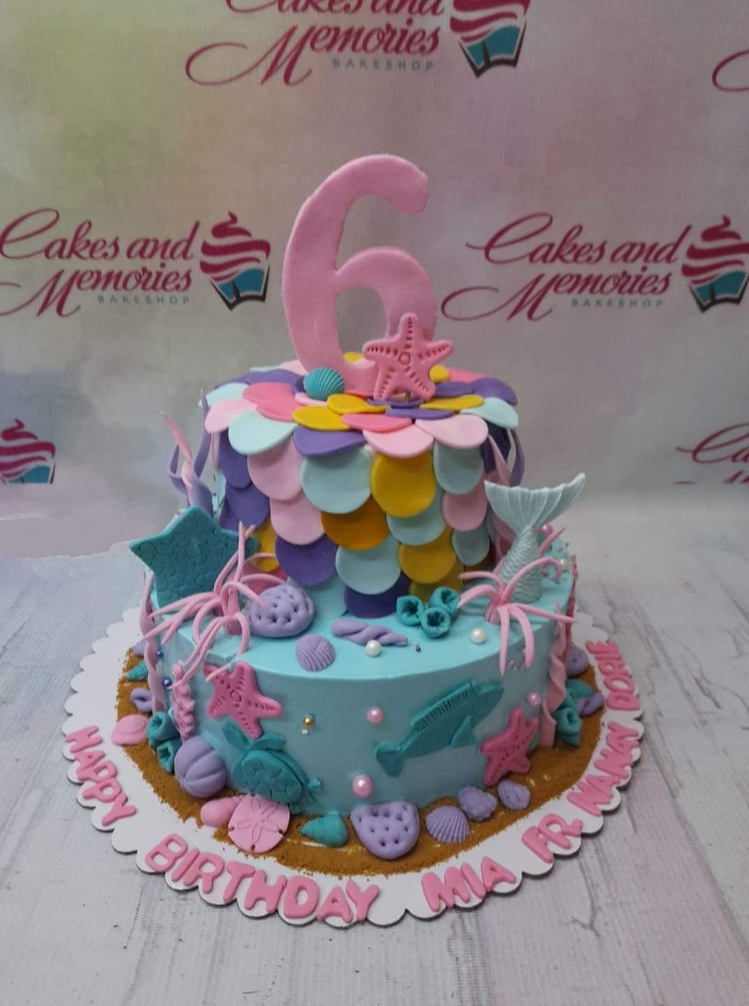 Two-tier mermaid themed birthday cake with colorful fondant scales, sea creatures, and a large pink number six topper.