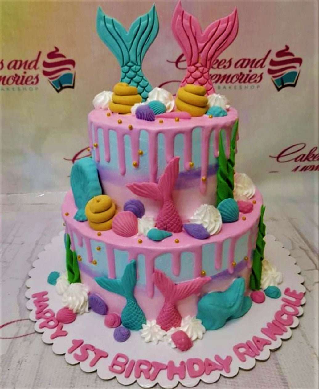 Two-tier mermaid themed birthday cake in pink and blue with fondant mermaid tails, shells, and seaweed decorations.
