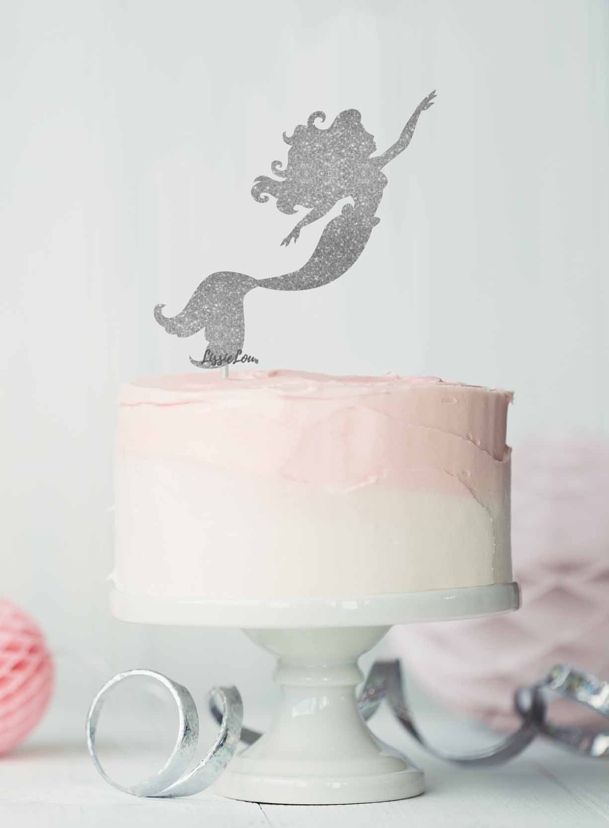 Minimalist pink and white ombre cake with a silver glitter mermaid silhouette topper on a white cake stand.