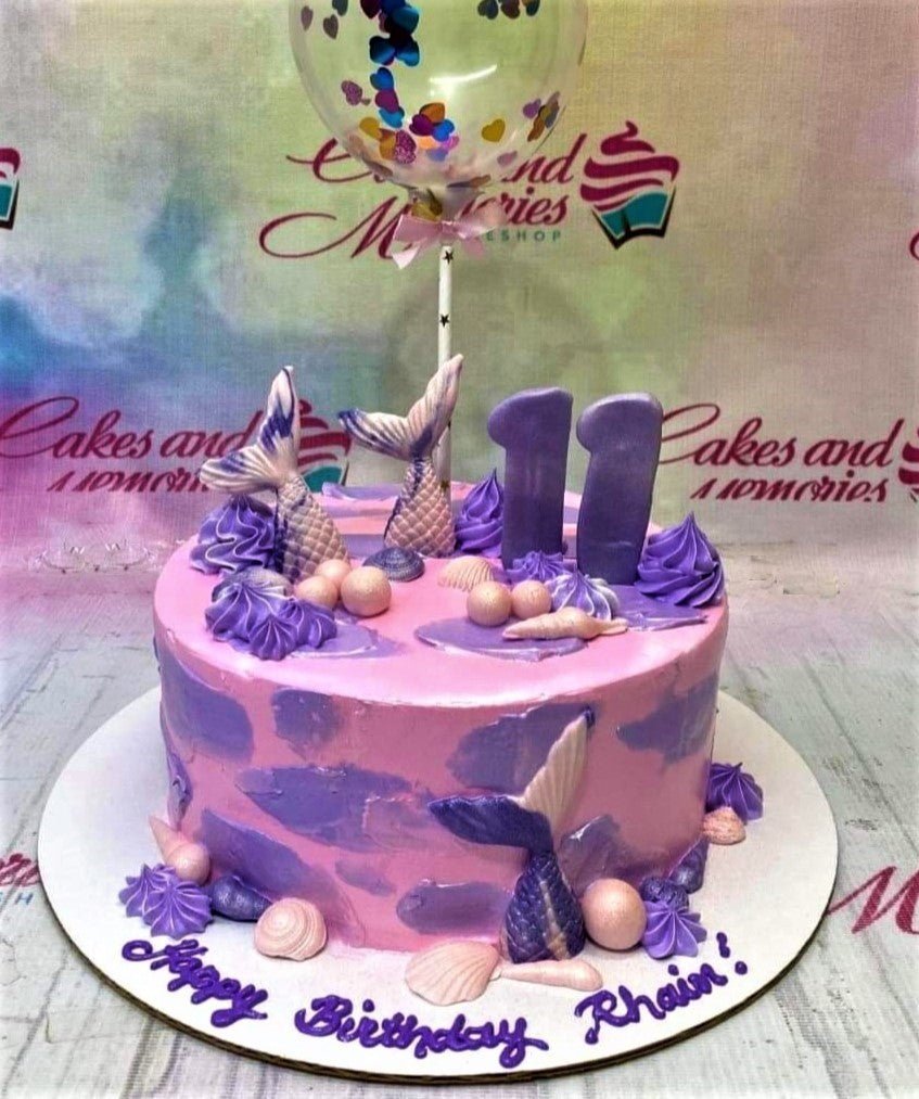 Pink and purple mermaid themed birthday cake with mermaid tails, seashells, and a confetti balloon topper.