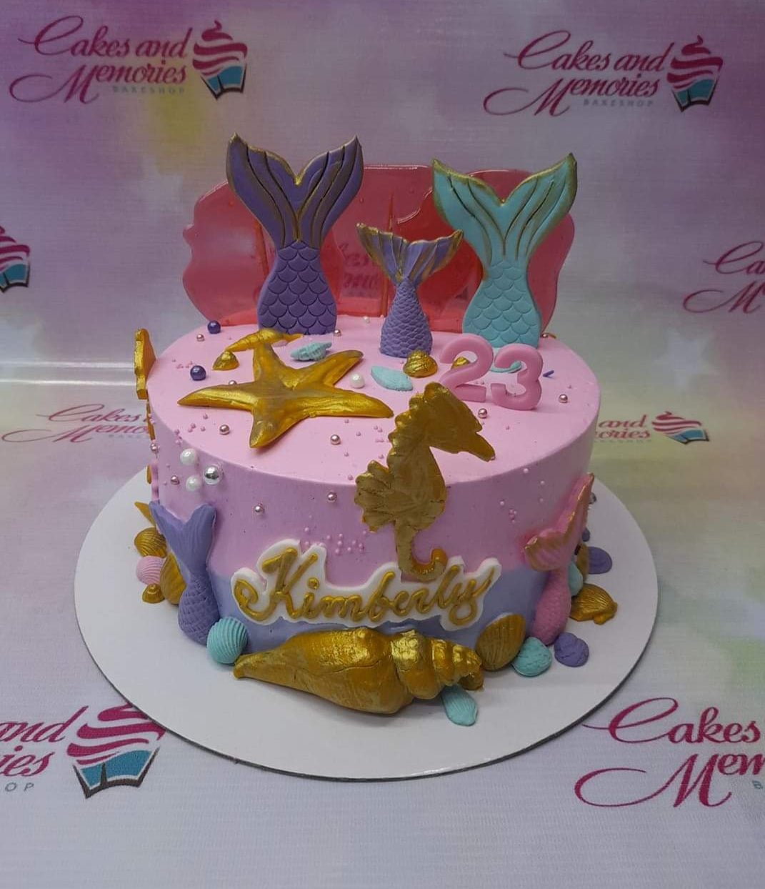 Pink mermaid themed birthday cake with gold starfish, seahorse, and purple mermaid tails for Kimberly's 23rd birthday.