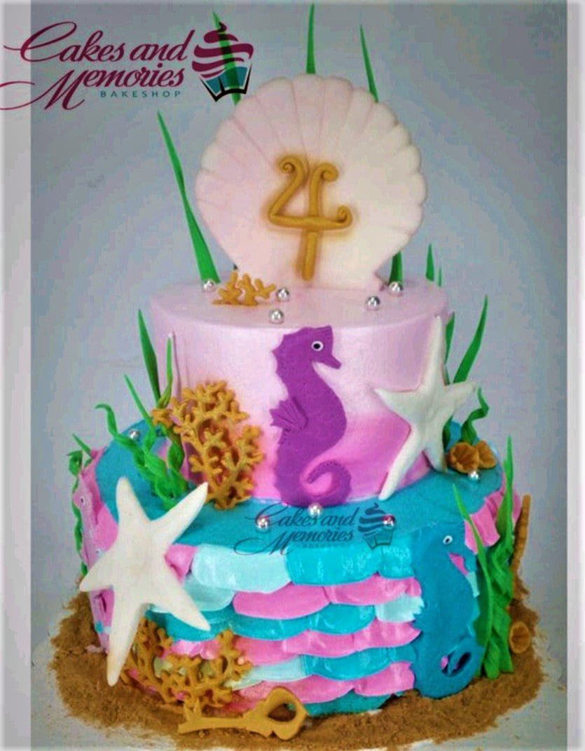 Two-tier mermaid themed cake with pink and teal icing, featuring seahorses, starfish, coral, and a large seashell topper with the number 4.