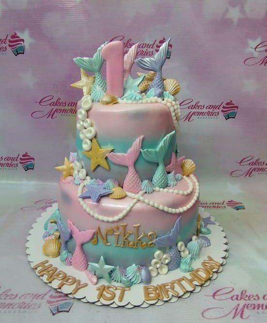 Two-tier mermaid themed birthday cake in pink and teal gradient with fondant mermaid tails, seashells, and pearls.