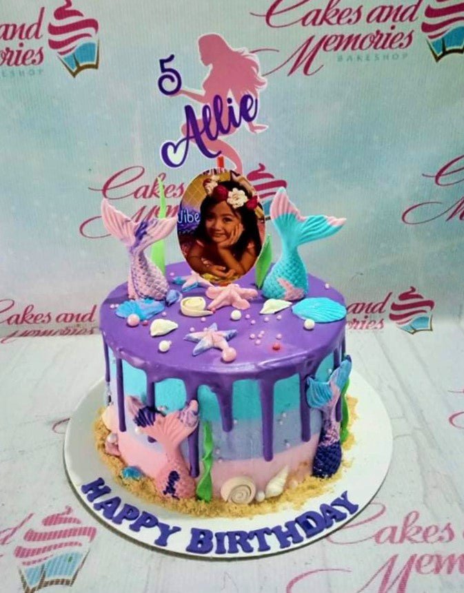 Mermaid themed birthday cake with purple drip, mermaid tails, and a photo topper for Allie's 5th birthday.