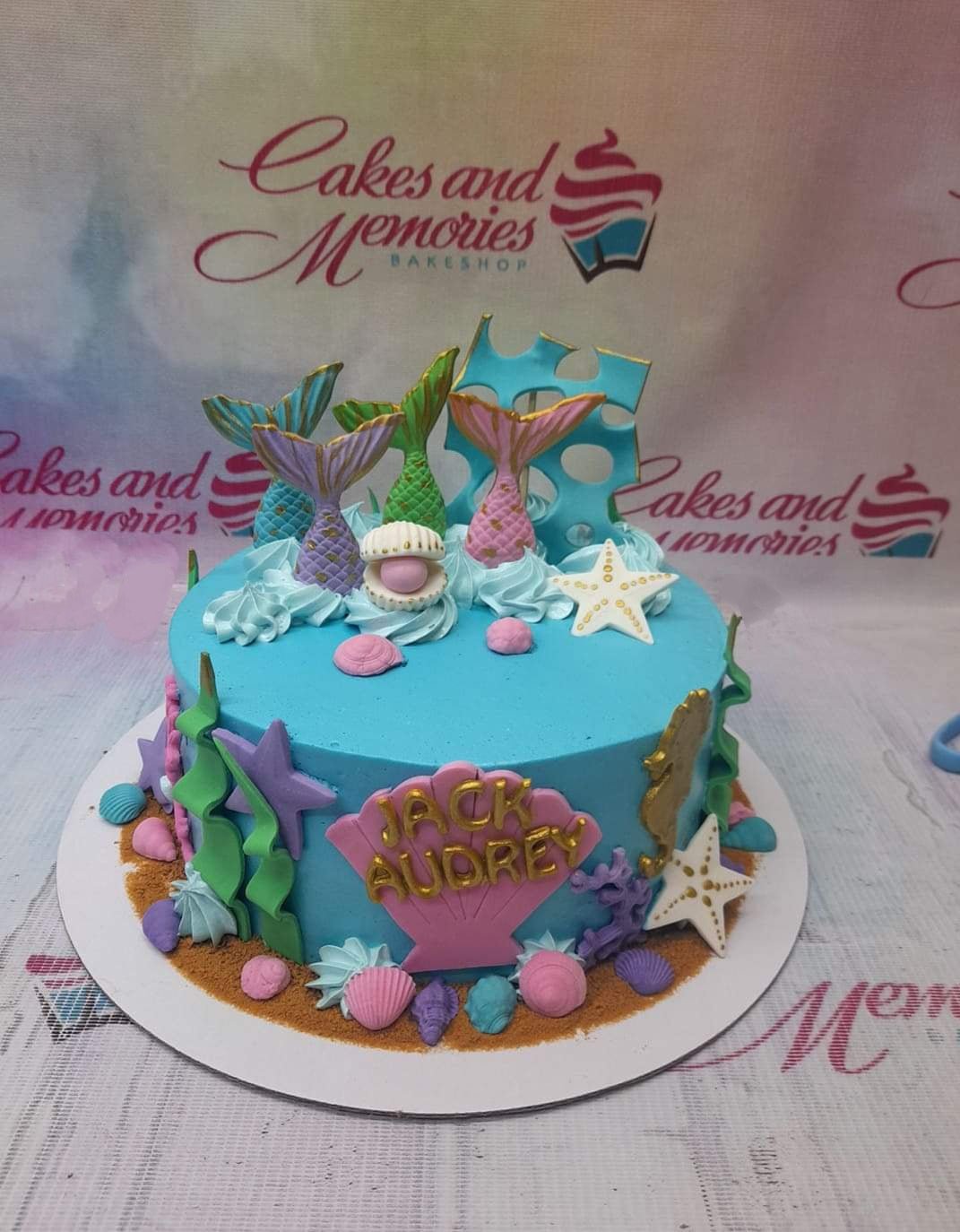 Blue mermaid themed birthday cake with pink shell message, mermaid tails, and sea life decorations.