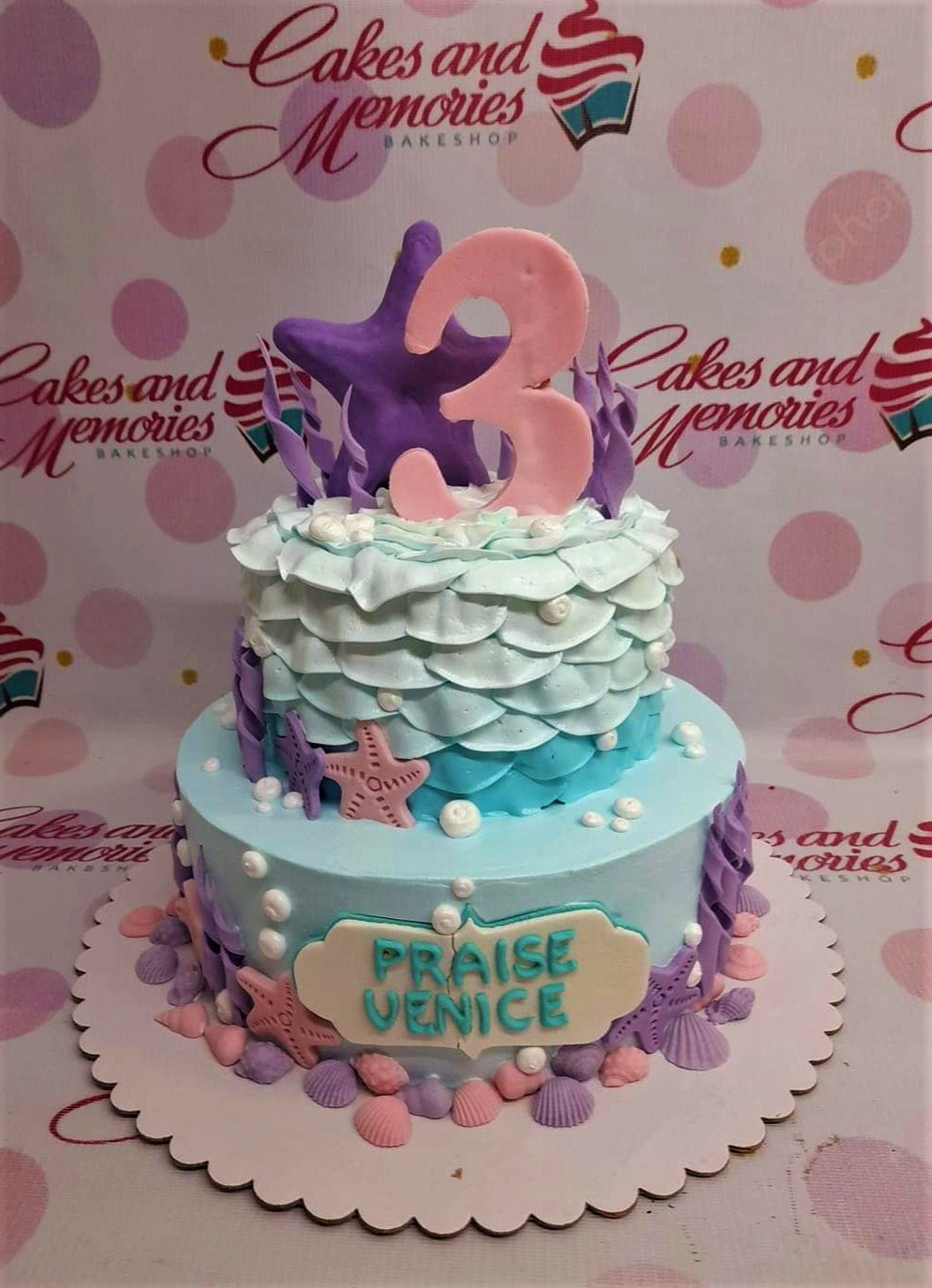 Two-tier mermaid themed cake with light blue and teal icing scales, purple starfish, and a large pink number three topper.