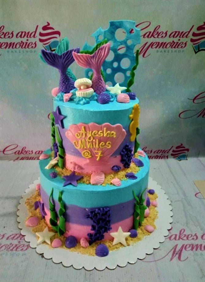 Two-tier mermaid themed birthday cake in blue, pink, and purple with fondant mermaid tails, shells, and sea creatures.