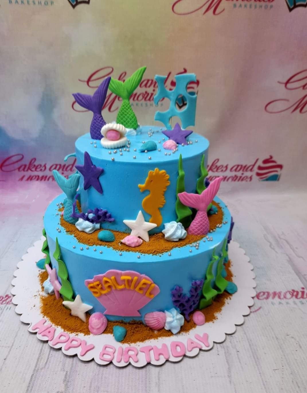 Two-tier light blue mermaid themed birthday cake with colorful fondant mermaid tails, seahorse, shells, and edible sand.