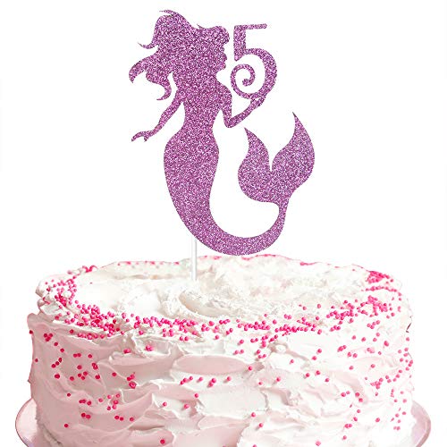 White soft-icing cake with pink sprinkles and a large purple glitter mermaid silhouette topper with the number five.
