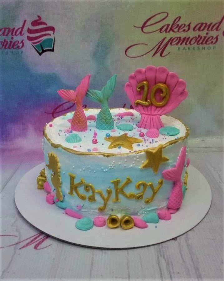 Under the sea themed birthday cake with pink and teal mermaid tails, a large pink shell with gold number 10, and gold stars.