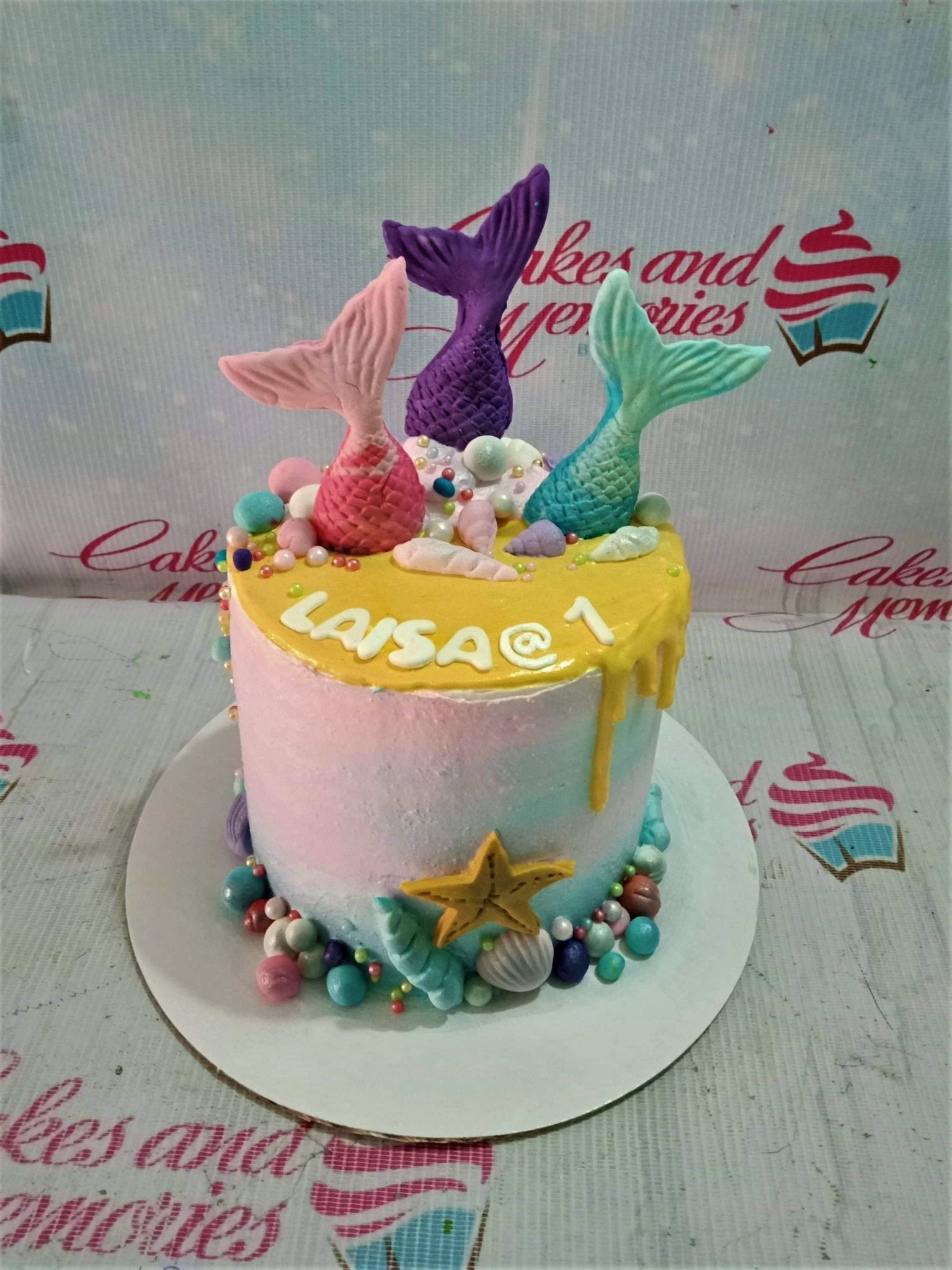 Mermaid themed birthday cake with pink, purple, and teal mermaid tails, yellow drip, and sea shell decorations.