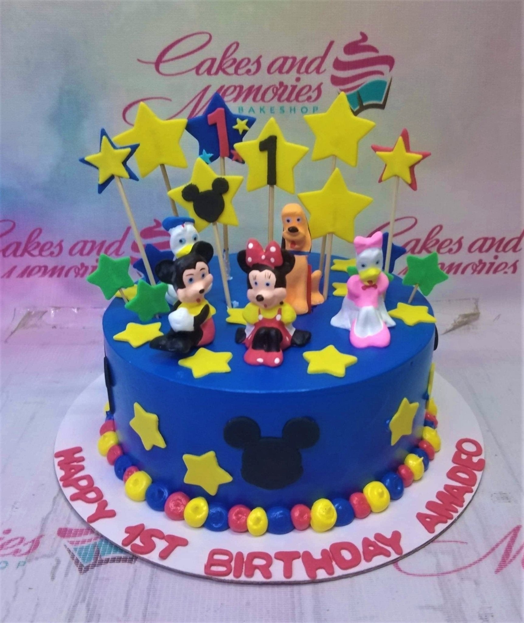 Blue Mickey Mouse and Friends themed birthday cake with 3D fondant characters and yellow stars.