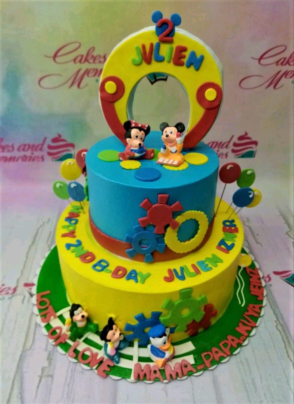 Two-tier Mickey Mouse Clubhouse themed cake in blue and yellow with fondant character figures and colorful gear decorations.