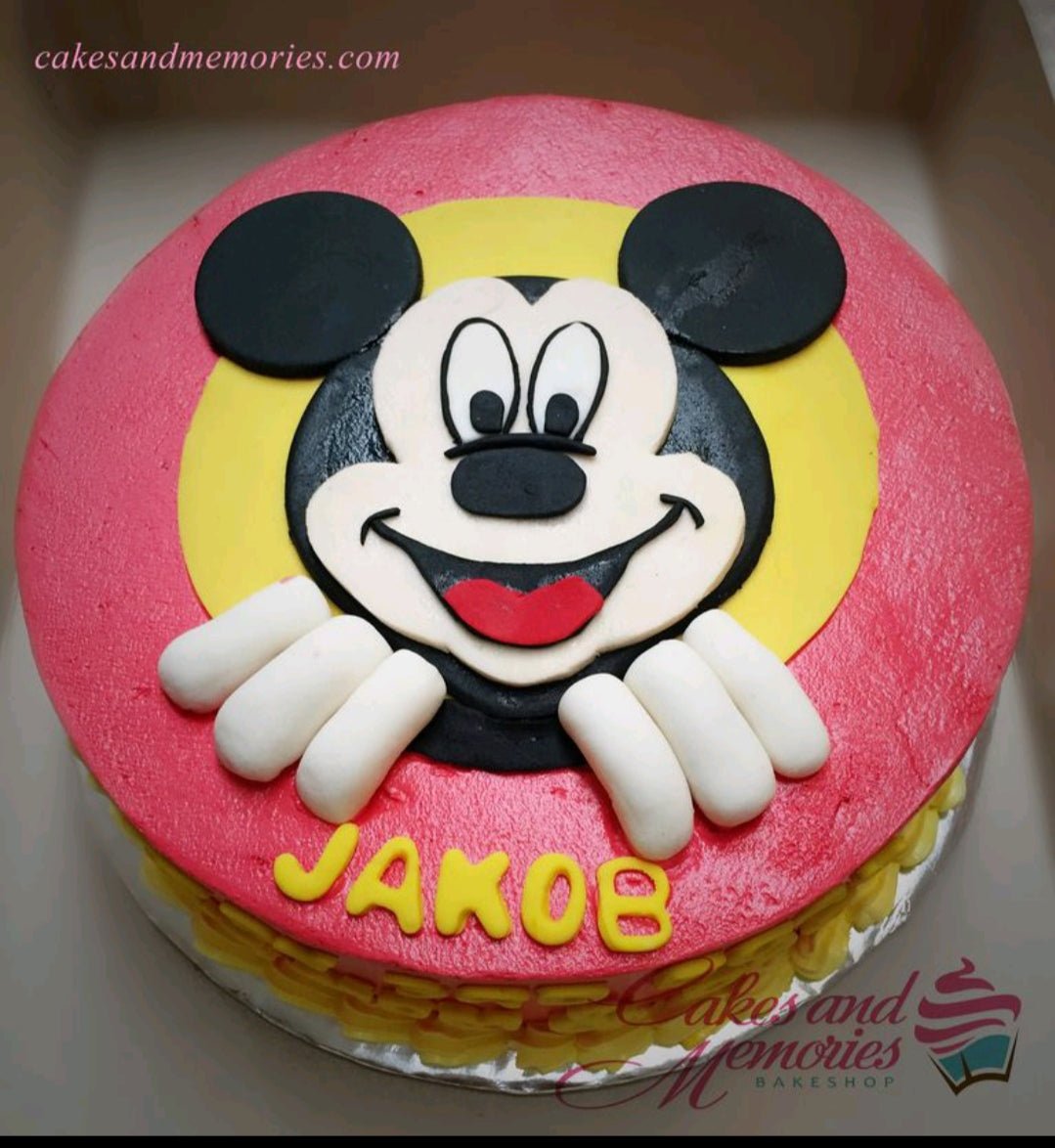 Mickey Mouse themed birthday cake with red icing, yellow circle backdrop, and 3D fondant Mickey face and hands.