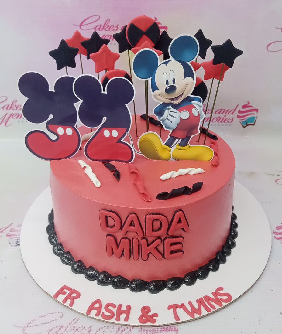Red Mickey Mouse themed birthday cake with number 32 toppers and black icing border