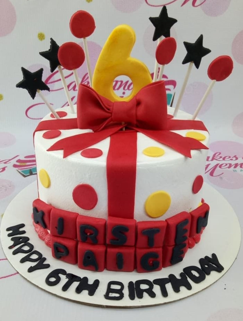 White fondant cake with red and yellow polka dots, a large red fondant bow, and a yellow number 6 topper with black stars.