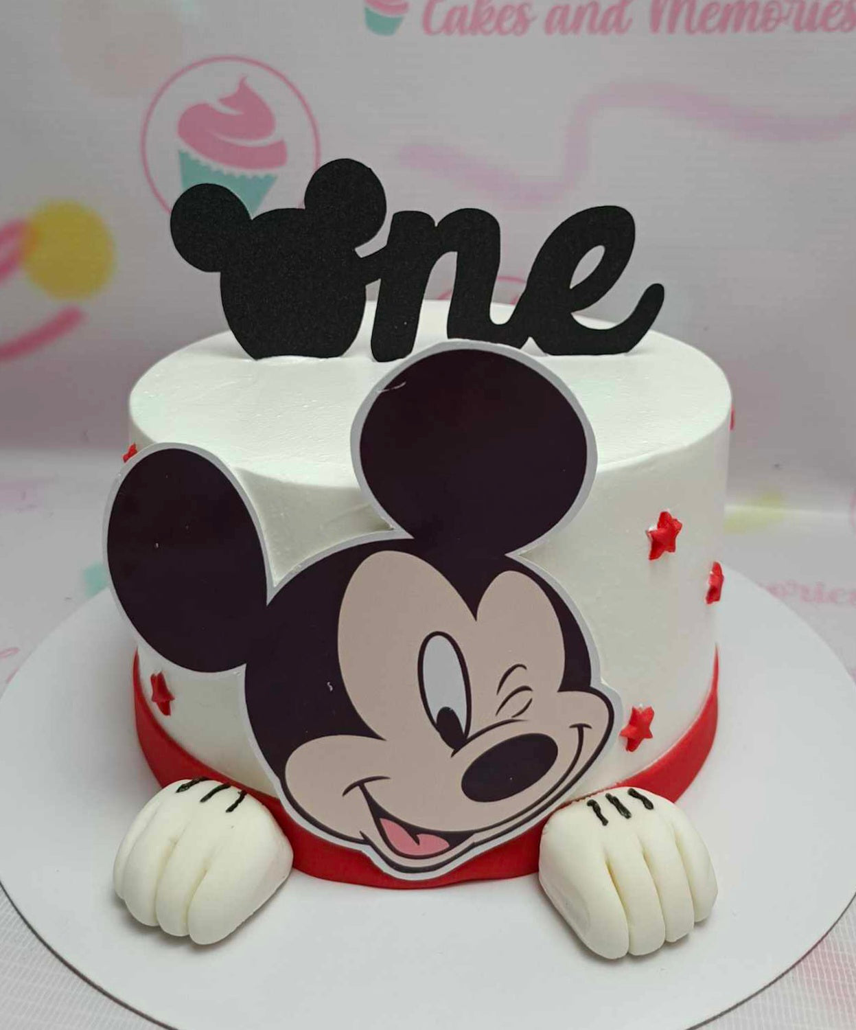 White Mickey Mouse themed birthday cake with a large winking Mickey printout on the side and a black Mickey silhouette 'one' topper.