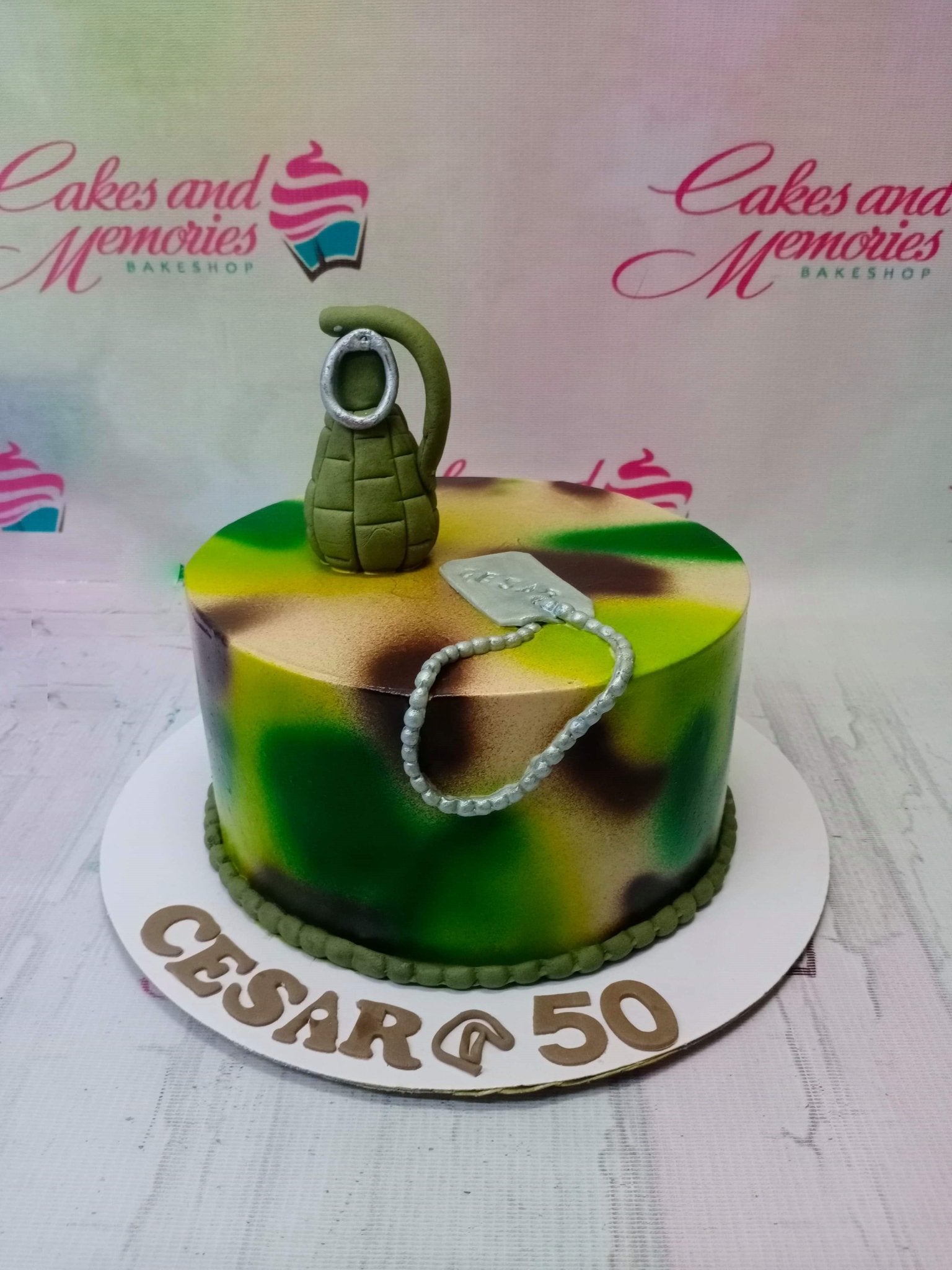 Military camouflage themed cake with a green fondant grenade and silver dog tag topper for a 50th birthday.
