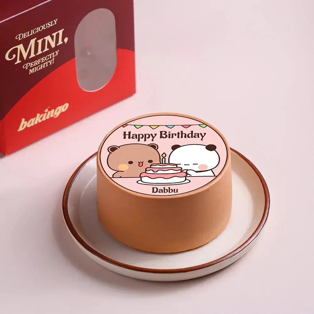 Bento cake with a pink top featuring a printed illustration of two cute bears celebrating with a cake and a Happy Birthday message.