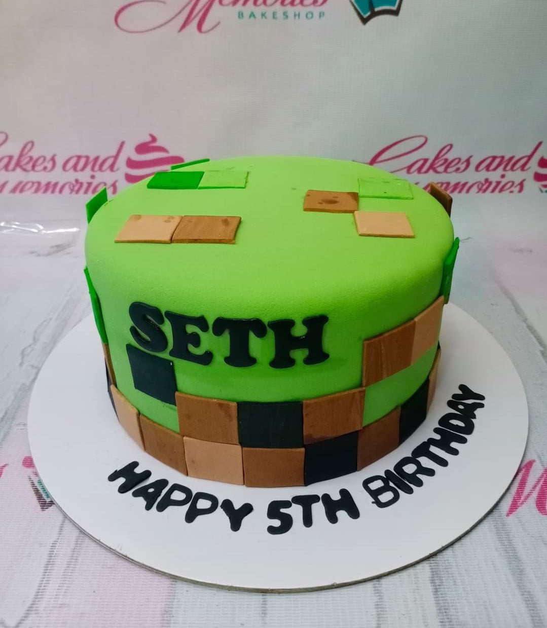 Minecraft themed green fondant cake with brown and black pixel squares and black gumpaste letters for Seth's 5th birthday.
