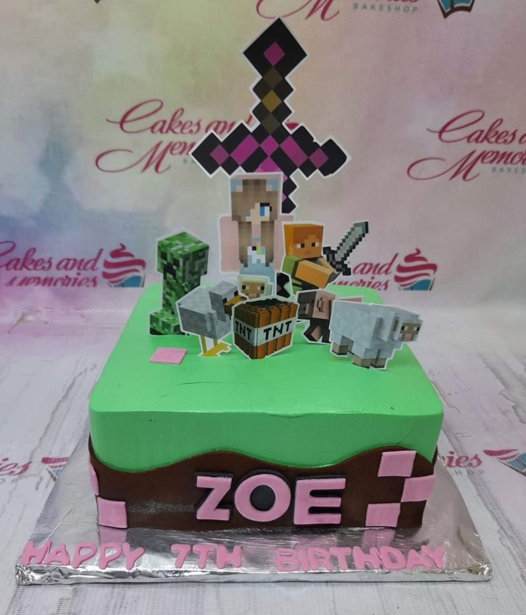 Minecraft themed square green cake with character printouts, a large pixel sword, and pink fondant accents for Zoe's 7th birthday.