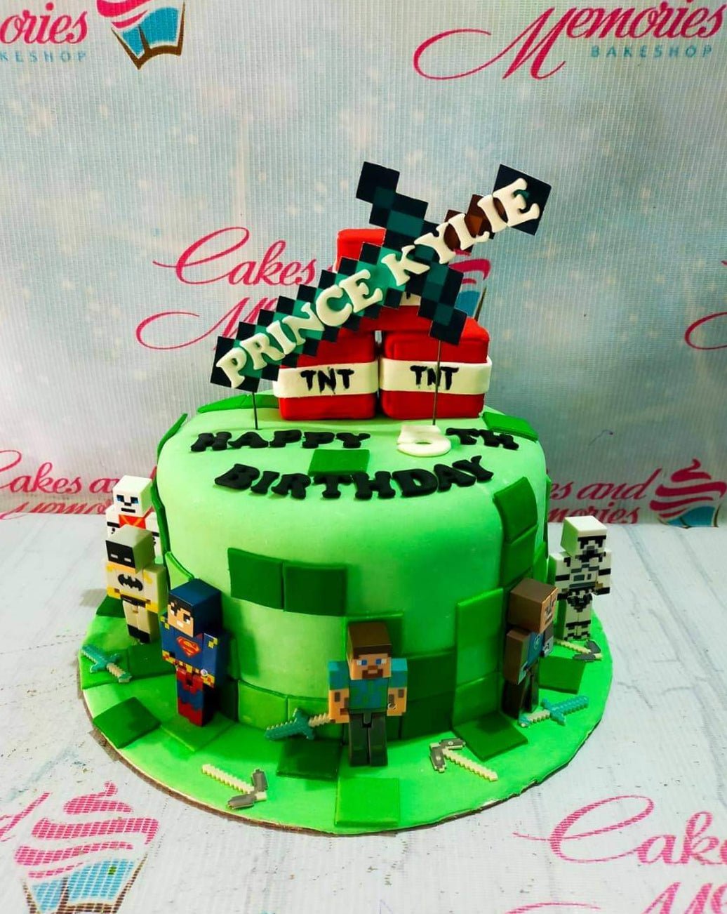 Minecraft themed green fondant cake with TNT blocks, Steve, Superman, and Stormtrooper figures for Prince Kylie's 5th birthday.