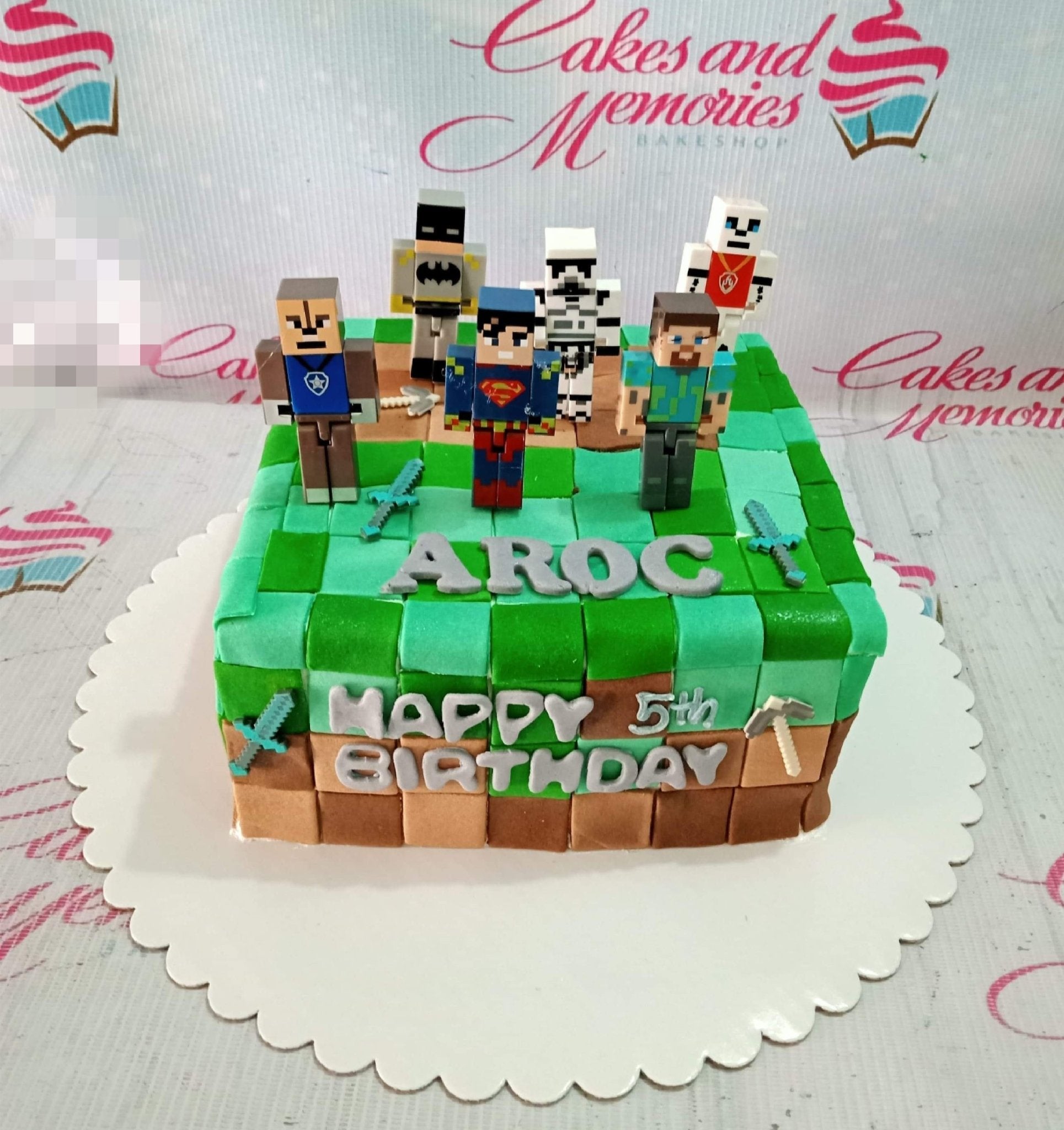 Minecraft and superhero themed square fondant cake with pixelated green and brown blocks and 3D character figures.