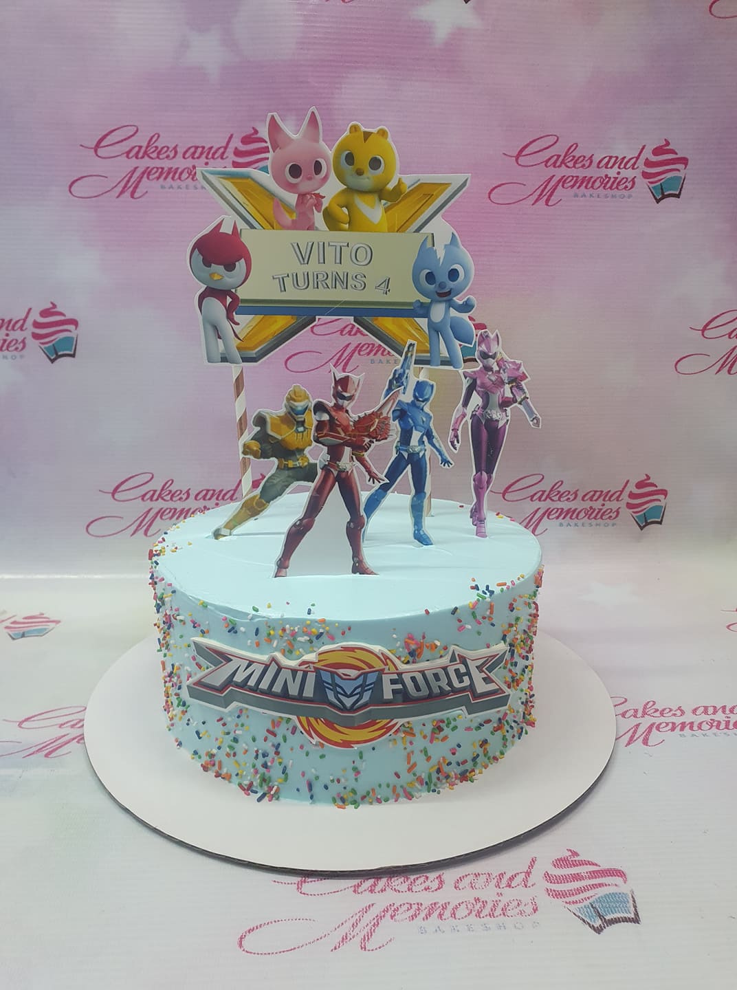 Light blue Miniforce themed birthday cake with character printouts and colorful sprinkles on the sides.